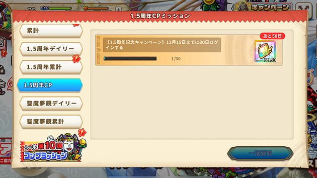 『ミッション』から『1.5周年CP』の『【1.5周年記念キャンペーン】12月15日までに30日ログインする』からログイン日数をご確認いただけます。
